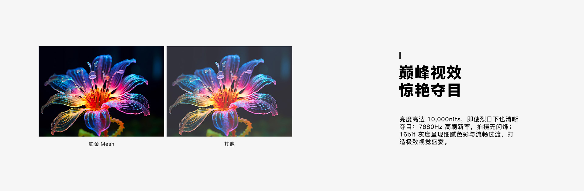 10000 nits 高亮度,7680 Hz 高刷新率,16-bit 灰阶,视觉效果极致