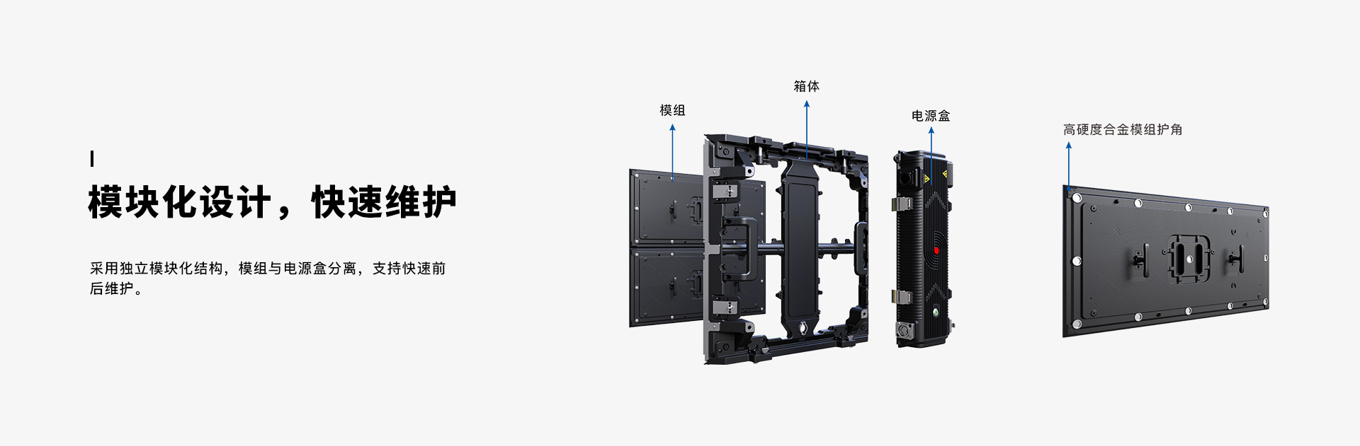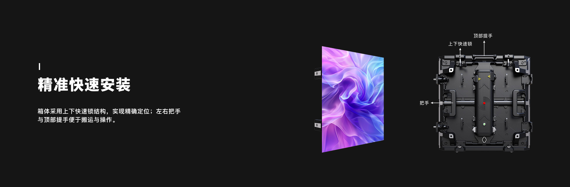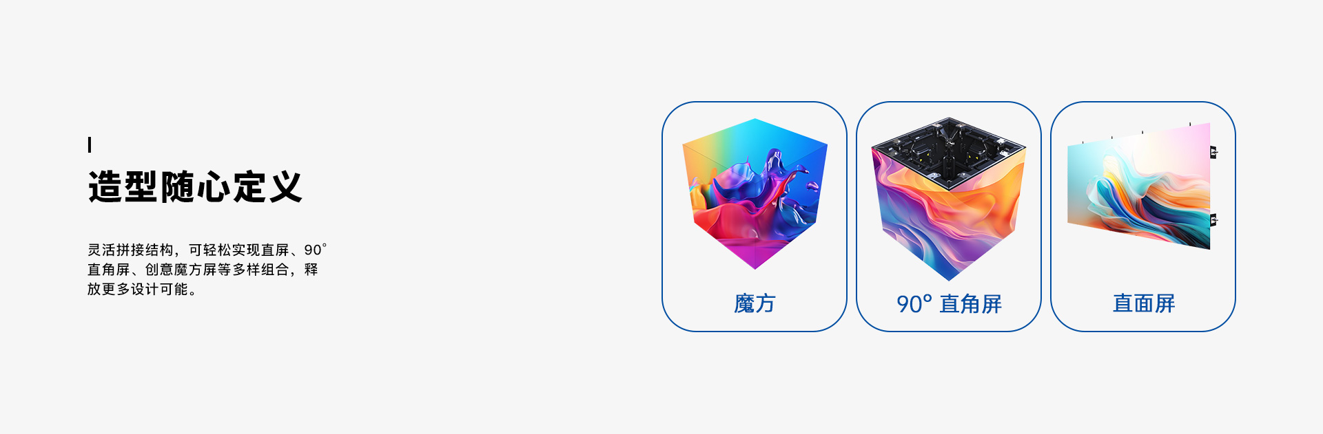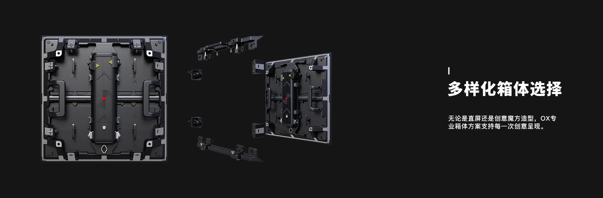 创意异形租赁解决方案 尺寸:500 * 500 (扇形/三角形) 间距:1.9mm, 2.6 mm, 2.9 mm, 3.9 mm 应用场景:舞美租赁、大型会议、展览、大型活动、演唱会等 核心优势 轻量模块化设计 前后轻松维护无需工具 高安全系数高强度箱体 缓冲保护设计 箱体可首尾自拼 兼容领灿租赁平台